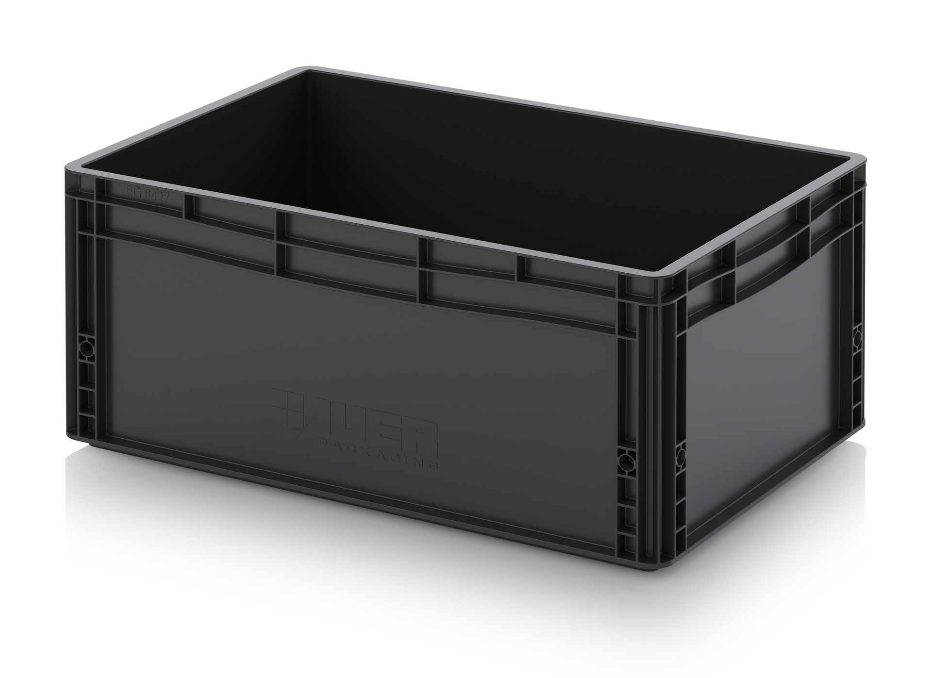 Евроконтейнер с ESD-защитой производства компании AUER Packaging изготавливается из антистатической пластмассы, что делает его пригодным, в частности, для надежного хранения и транспортировки электронной продукции.