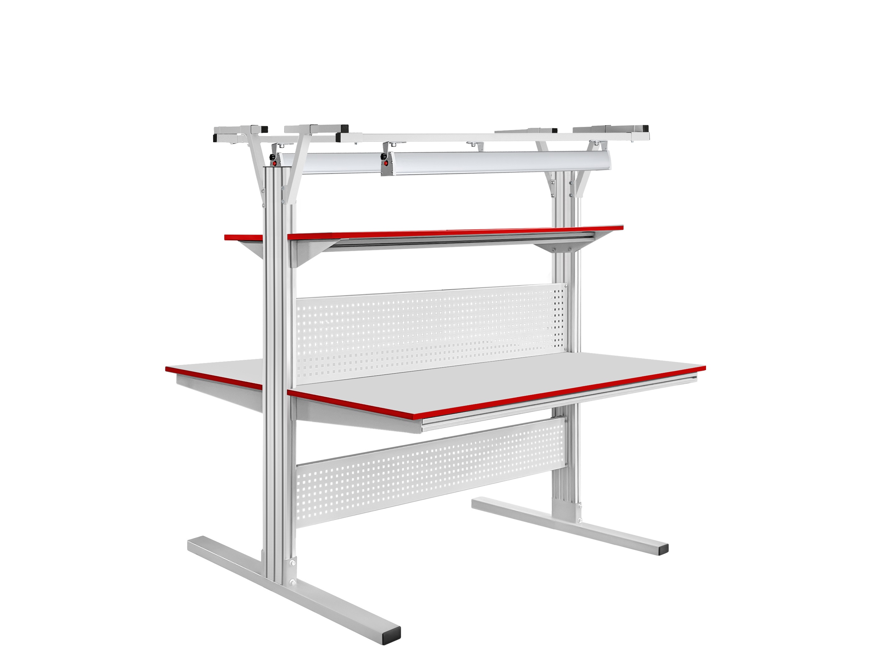Каркас стола изготовлен из конструкционного профиля и металлических кронштейнов. Регулировка высоты столешницы и полок осуществляется по конструкционному профилю 135х45 мм с помощью металлических кронштейнов. Распределенная нагрузка на стол — до 200 кг. Конструкция стола позволяет оснастить его дополнительным оборудованием.