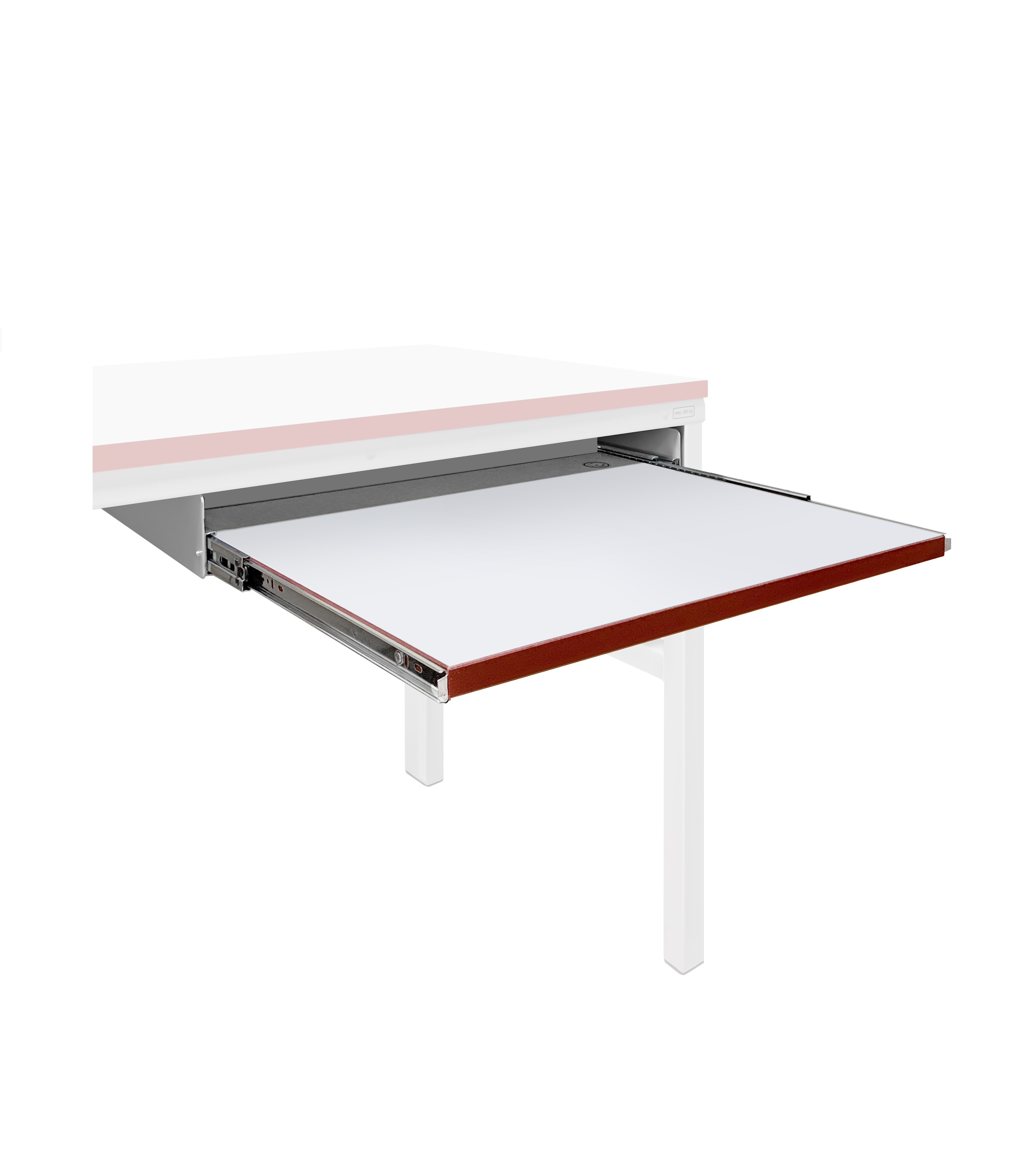 Полка выдвижная предназначена для размещения оборудования, документации и комплектующих небольшого размера. Полка устанавливается под столешницей в доступном по ширине полки для ее установки месте. Расстояние от поверхности полки до каркаса стола 50 мм. Распределенная нагрузка на полку до 15 кг. Полка изготавливается в промышленном и антистатическом ESD исполнении.