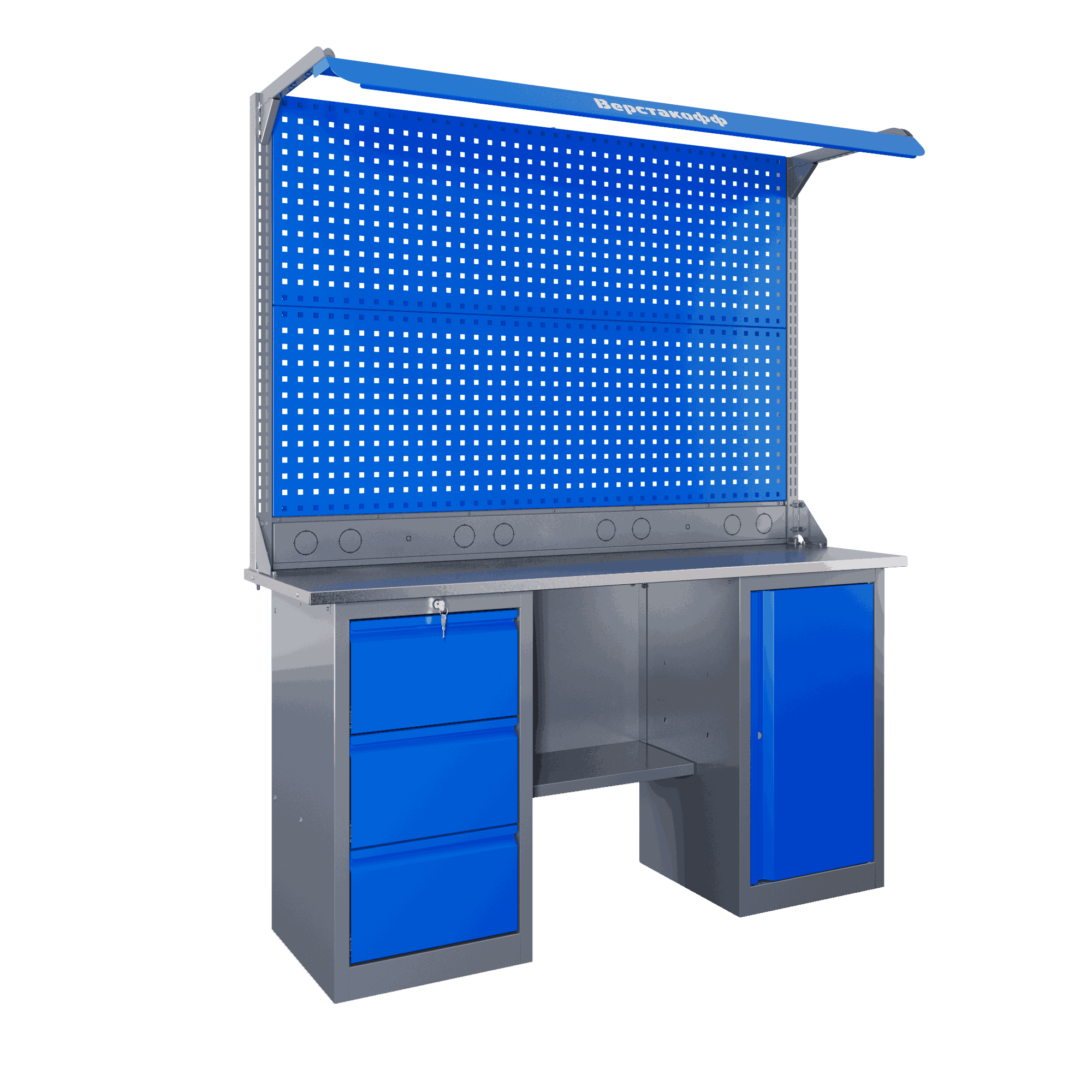 Габариты 1967x1600x500 мм дают колоссальный простор для действий. Двухтумбовая компоновка предлагает вместительные ящики для систематизации инструмента и метизов. Важное преимущество — встроенная подсветка, которая обеспечивает отличную видимость в рабочей зоне при любой освещенности цеха. Дополнительная полка-стенка расширяет возможности хранения, освобождая столешницу от лишних предметов. Произведенный в России из высококачественных материалов, верстак рассчитан на 7 лет активной эксплуатации и подкреплен фирменной гарантией 3 года. Строгий серый цвет покрытия устойчив к загрязнениям и сохраняет опрятный вид в условиях интенсивного использования.