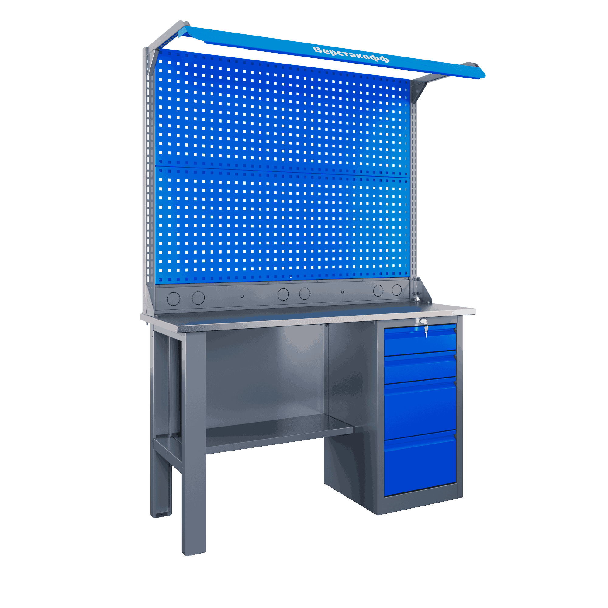 Сердце конструкции — усиленная столешница из 24-миллиметровой влагостойкой фанеры, укрытой прочной оцинкованной сталью толщиной 1,2 мм. Такое покрытие не боится масла, царапин и агрессивных сред, гарантируя сохранность внешнего вида на весь срок эксплуатации в 7 лет. Несущий каркас из холоднокатаной стали (0,8 мм) обеспечивает жесткость, а перфорированный экран 12х12 мм открывает безграничные возможности для хранения инструмента.