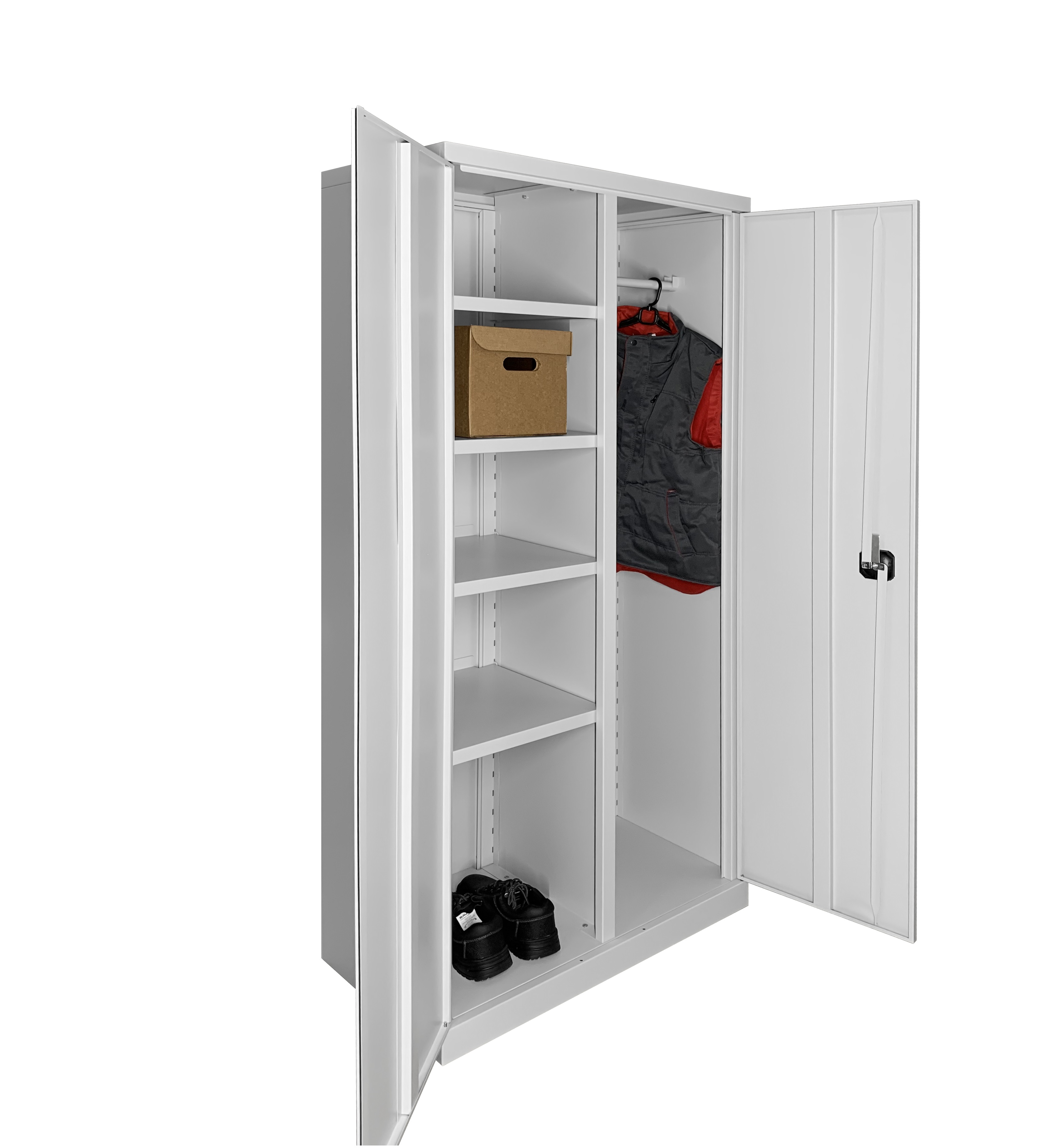 Металлический шкаф серии ШО оснащен замками типа CAM LOCK с тягами; секретность 2000 комбинаций. В стандартной комплектации имеет два разделённых вертикальных отсека. В одном расположены 4 полки, а в другом - укороченная штанга для одёжных вешалок. Полки регулируются по высоте с шагом 50 мм. Рекомендуемая нагрузка на полку не более 30 кг.