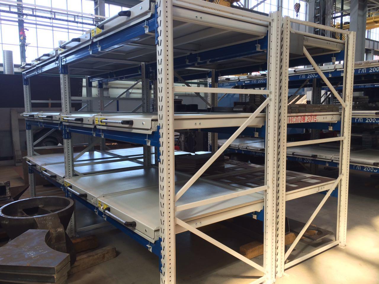 - Выкатная платформа на шарикоподшипниковых направляющих, закрепленных на балках стеллажа при помощи стяжных кронштейнов (4 шт/платформу), с ручкой и фиксатором (блокировка выкатывания)