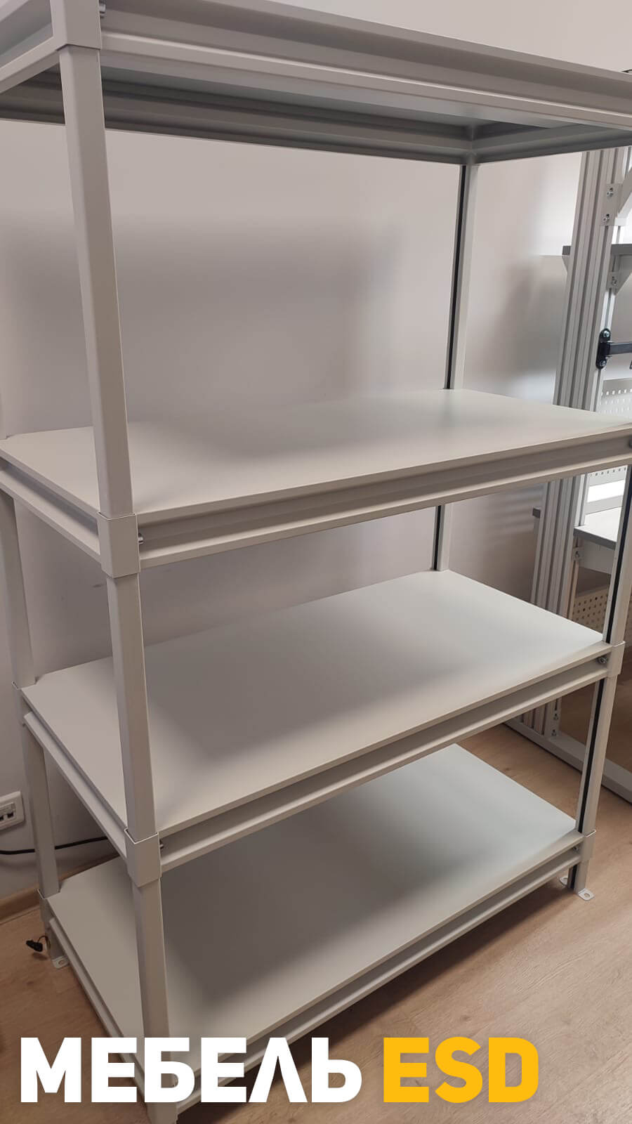 Стеллаж антистатический СУМ ESD окрашен полимерной антистатической порошковой краской, защищающей электронные компоненты от электростатического заряда. В антистатическом исполнении, согласно требованиям стандарта ГОСТ IEC 61340-5-1-2019, на лицевой стороне имеется маркировка