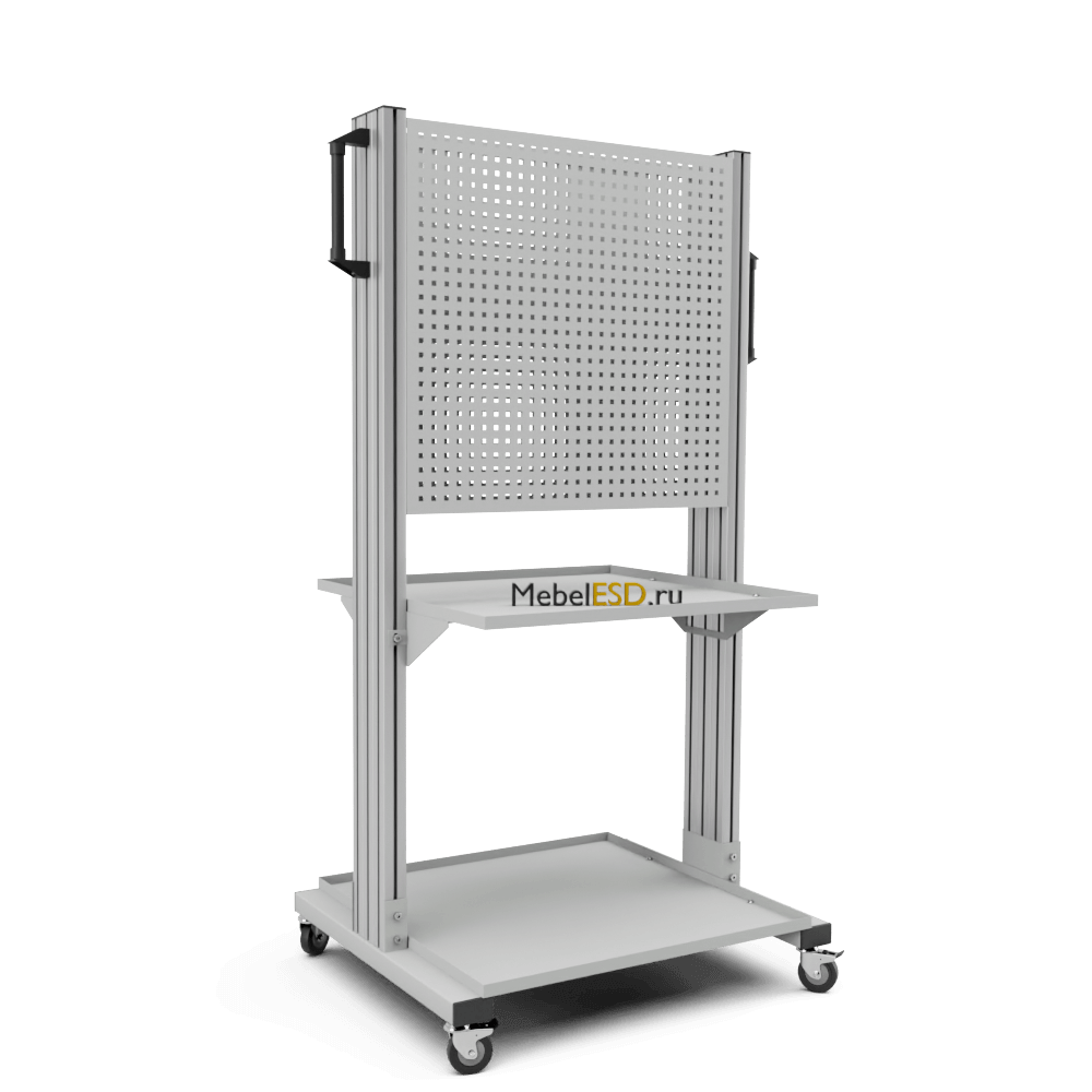 Стойка подкатная лабораторная СПЛ-КП - универсальное, мобильное решение в линейке промышленной мебели, торговой марки Gresson®️. Стойка подкатная СПЛ-КП может быть использована в различных отраслях промышленности, от учебных заведений, НИИ и лабораторий, до сервисных центров, офисных и складских помещений. Подкатная стойка СПЛ-КП в своём составе имеет зеркальную перфорированную стенку для размещения элементов дополнительного оборудования перфопанели, таких как крючки и держатели (КР-1 - КР-12), две металлических полки с бортами для размещения вспомогательного инструмента и оборудования - нижнюю фиксированную и верхнюю с плавной регулировкой высоты, а так же удобную боковую ручку.