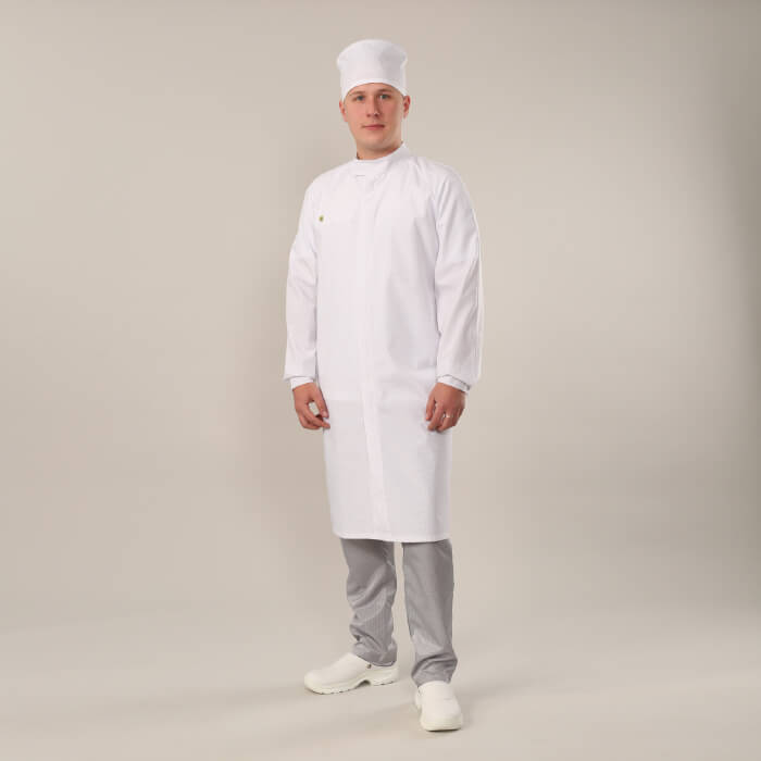 Халаты рекомендуется использовать в комплекте с головным убором и брюками из соответствующей ткани.