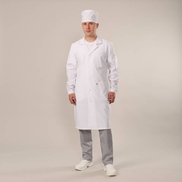 Халат прямого силуэта с центральной бортовой застежкой на кнопки. Рукава длинные, прямые, втачные, одношовные с цельнокроёнными манжетами, застёгивающимися на кнопки (2 положения фиксации). На внешней стороне левого рукава настрочена нашивка с надписью «Одежда технологическая для персонала чистых помещений», с таблицей циклов обработки и датой выпуска изделия. На нашивке имеется свободное место для нанесения потребителем знаков идентификации персонала. Воротник — отложной с лацканами. С изнаночной стороны под воротником вшита вешалка. Спереди находятся два нижних накладных кармана и один нагрудный накладной карман. В левый нижний карман вшит знак EPA. Спинка с кокеткой, из-под которой заложены складки. Сзади по линии талии — хлястик с застежкой на кнопки.