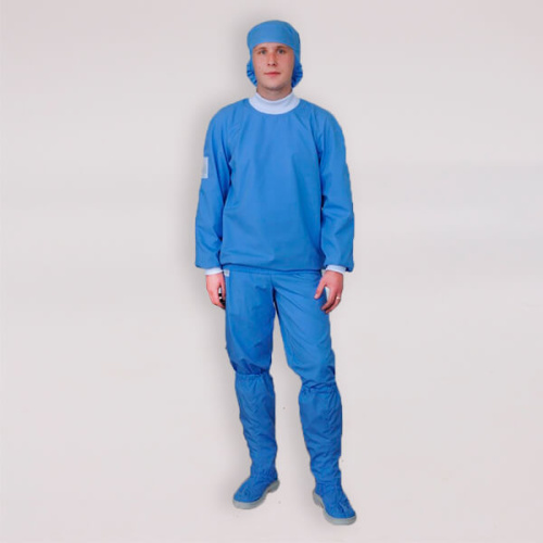 Куртка свободного силуэта, горловина обработана воротником стойкой из трикотажного подвяза. Рукава длинные, прямые, втачные, одношовные, по низу манжеты из трикотажного подвяза. На внешней стороне левого рукава настрочена нашивка с надписью «Одежда технологическая для персонала чистых помещений», с таблицей циклов обработки и датой выпуска изделия. На нашивке имеется свободное место для нанесения потребителем знаков идентификации персонала. На полочке один нагрудный в каторый вшит знак EPA. Спинка цельнокроеная. Низ куртки стянут эластичной тесьмой с перфорацией, по боковым швам пришиты пуговицы, что позволяет регулировать прилегание. Брюки характеризуются прямым силуэтом, по поясу стянуты эластичной тесьмой и шнуром. По низу брюк манжеты из трикотажного подвяза. В правый боковой шов вшит знак EPA. На внешней стороне брюк настрочена нашивка с надписью «Одежда технологическая для персонала чистых помещений», с таблицей циклов обработки и датой выпуска изделия. На нашивке имеется свободное место для нанесения потребителем знаков идентификации персонала. Модельные особенности призваны способствовать выполнению требований к промышленной чистоте.